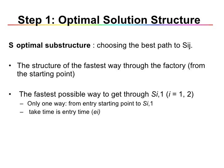 23. 23. Step 1: Optimal Solution Structure <ul><li>􀂄 optimal substructure : choosing the best path to Sij. </li></ul><ul><li>The structure of the fastest way through the factory (from the starting point) </li></ul><ul><li>The fastest possible way to get through Si ,1 ( i = 1, 2) </li></ul><ul><ul><li>Only one way: from entry starting point to Si ,1 </li></ul></ul><ul><ul><li>take time is entry time ( ei) </li></ul></ul>