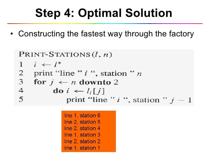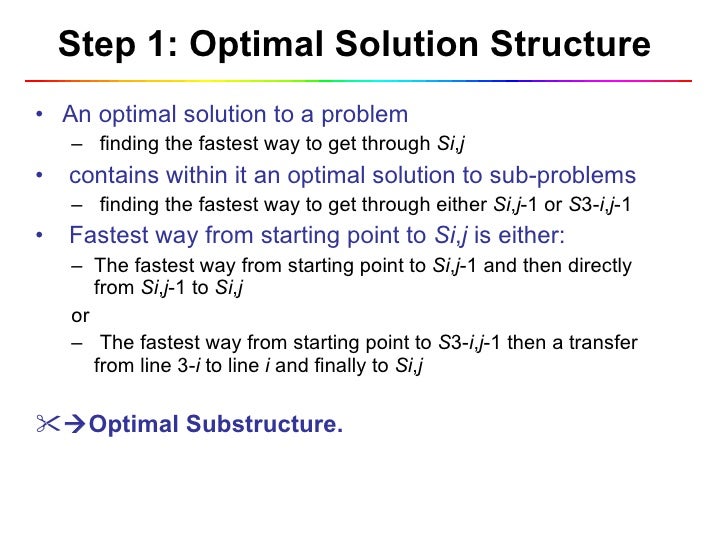 25. 25. Step 1: Optimal Solution Structure <ul><li>An optimal solution to a problem </li></ul><ul><ul><li>finding the fastest way to get through Si , j </li></ul></ul><ul><li>contains within it an optimal solution to sub-problems </li></ul><ul><ul><li>finding the fastest way to get through either Si , j -1 or S 3- i , j -1 </li></ul></ul><ul><li>Fastest way from starting point to Si , j is either: </li></ul><ul><ul><li>The fastest way from starting point to Si , j -1 and then directly from Si , j -1 to Si , j </li></ul></ul><ul><ul><li>or </li></ul></ul><ul><ul><li>The fastest way from starting point to S 3- i , j -1 then a transfer from line 3- i to line i and finally to Si , j </li></ul></ul><ul><li> Optimal Substructure. </li></ul>