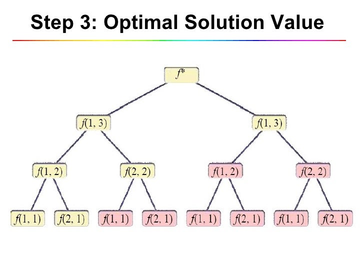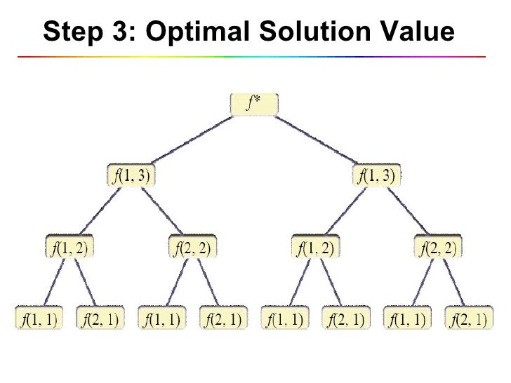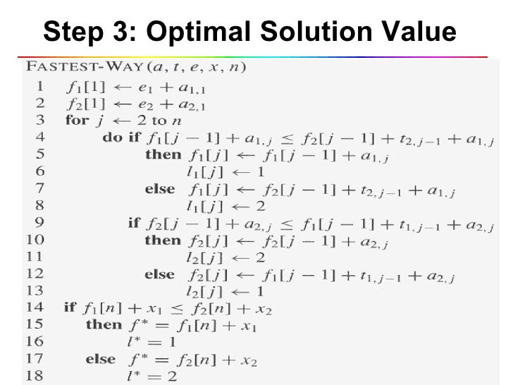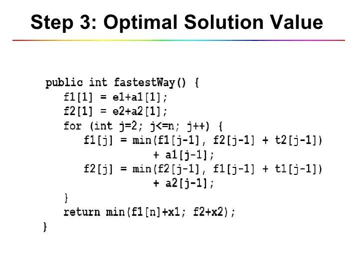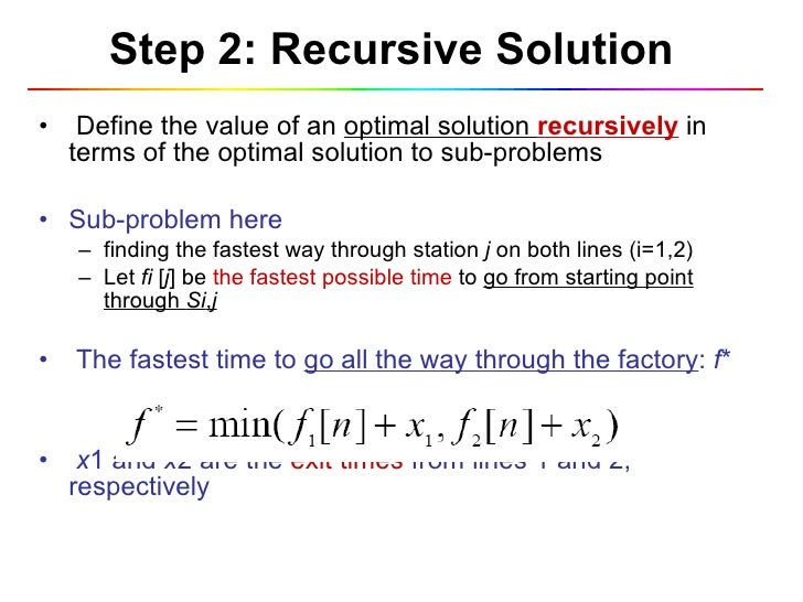 27. 29. Step 2: Recursive Solution <ul><li>Define the value of an optimal solution recursively in terms of the optimal solution to sub-problems </li></ul><ul><li>Sub-problem here </li></ul><ul><ul><li>finding the fastest way through station j on both lines (i=1,2) </li></ul></ul><ul><ul><li>Let fi [ j ] be the fastest possible time to go from starting point through Si , j </li></ul></ul><ul><li>The fastest time to go all the way through the factory : f * </li></ul><ul><li>x 1 and x 2 are the exit times from lines 1 and 2, respectively </li></ul>
