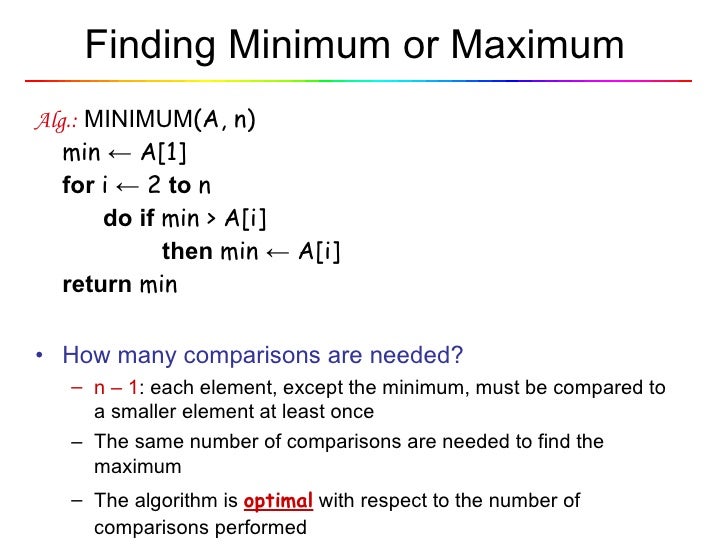3. 3. Finding Minimum or Maximum <ul><li>Alg.: MINIMUM (A, n) </li></ul><ul><li>min ← A[1] </li></ul><ul><li>for i ← 2 to n </li></ul><ul><li> do if min > A[i] </li></ul><ul><li> then min ← A[i] </li></ul><ul><li>return min </li></ul><ul><li>How many comparisons are needed? </li></ul><ul><ul><li>n – 1 : each element, except the minimum, must be compared to a smaller element at least once </li></ul></ul><ul><ul><li>The same number of comparisons are needed to find the maximum </li></ul></ul><ul><ul><li>The algorithm is optimal with respect to the number of comparisons performed </li></ul></ul>