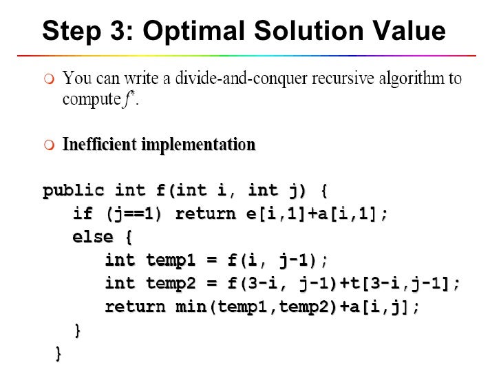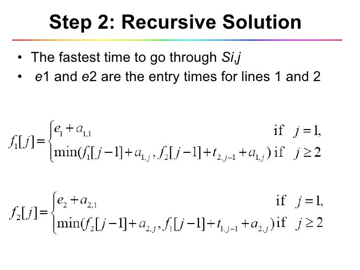 28. 30. Step 2: Recursive Solution <ul><li>The fastest time to go through Si , j </li></ul><ul><li>e 1 and e 2 are the entry times for lines 1 and 2 </li></ul>