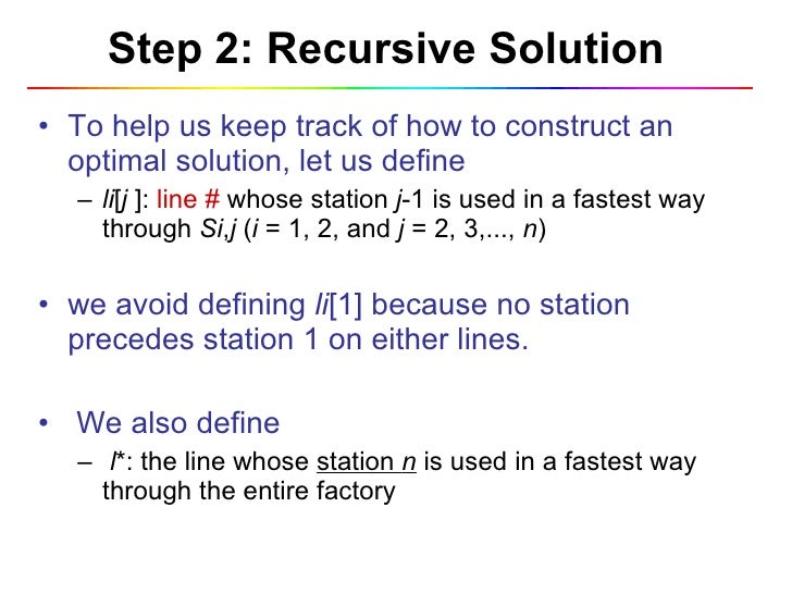31. 33. Step 2: Recursive Solution <ul><li>To help us keep track of how to construct an optimal solution, let us define </li></ul><ul><ul><li>li [ j ]: line # whose station j -1 is used in a fastest way through Si , j ( i = 1, 2, and j = 2, 3,..., n ) </li></ul></ul><ul><li>we avoid defining li [1] because no station precedes station 1 on either lines. </li></ul><ul><li>We also define </li></ul><ul><ul><li>l *: the line whose station n is used in a fastest way through the entire factory </li></ul></ul>