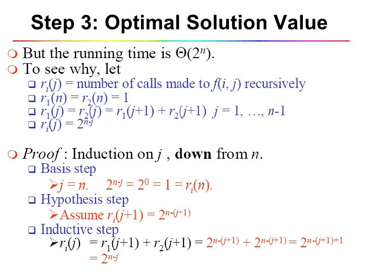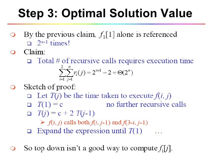 12. 12. Dynamic programming <ul><li>Dynamic programming is a way of improving on inefficient divide-and-conquer algorithms. </li></ul><ul><li>By “ inefficient ”, we mean that the same recursive call is made over and over . </li></ul><ul><li>If same subproblem is solved several times , we can use table to store result of a subproblem the first time it is computed and thus never have to recompute it again. </li></ul><ul><li>Dynamic programming is applicable when the subproblems are dependent , that is, when subproblems share subsubproblems. </li></ul><ul><li>“ Programming” refers to a tabular method </li></ul>