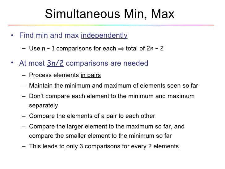 4. 4. Simultaneous Min, Max <ul><li>Find min and max independently </li></ul><ul><ul><li>Use n – 1 comparisons for each  total of 2n – 2 </li></ul></ul><ul><li>At most 3n/2 comparisons are needed </li></ul><ul><ul><li>Process elements in pairs </li></ul></ul><ul><ul><li>Maintain the minimum and maximum of elements seen so far </li></ul></ul><ul><ul><li>Don’t compare each element to the minimum and maximum separately </li></ul></ul><ul><ul><li>Compare the elements of a pair to each other </li></ul></ul><ul><ul><li>Compare the larger element to the maximum so far, and compare the smaller element to the minimum so far </li></ul></ul><ul><ul><li>This leads to only 3 comparisons for every 2 elements </li></ul></ul>