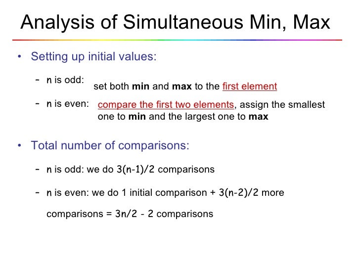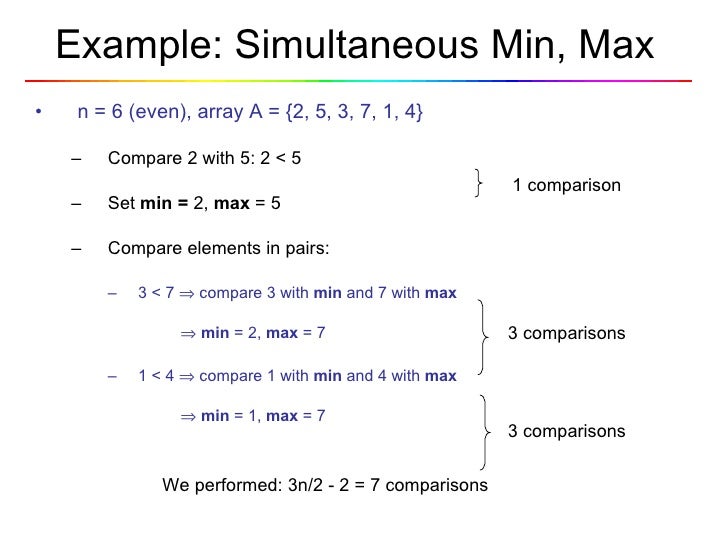 6. 6. Example: Simultaneous Min, Max <ul><li>n = 5 (odd), array A = {2, 7, 1, 3, 4} </li></ul><ul><ul><li>Set min = max = 2 </li></ul></ul><ul><ul><li>Compare elements in pairs: </li></ul></ul><ul><ul><ul><li>1 < 7  compare 1 with min and 7 with max  min = 1, max = 7 </li></ul></ul></ul><ul><ul><ul><li>3 < 4  compare 3 with min and 4 with max  min = 1, max = 7 </li></ul></ul></ul>We performed: 3(n-1)/2 = 6 comparisons 3 comparisons 3 comparisons
