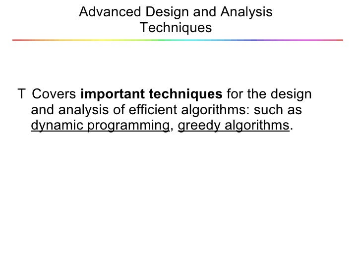 8. 8. Advanced Design and Analysis Techniques <ul><li>􀂄 Covers important techniques for the design and analysis of efficient algorithms: such as dynamic programming , greedy algorithms . </li></ul>