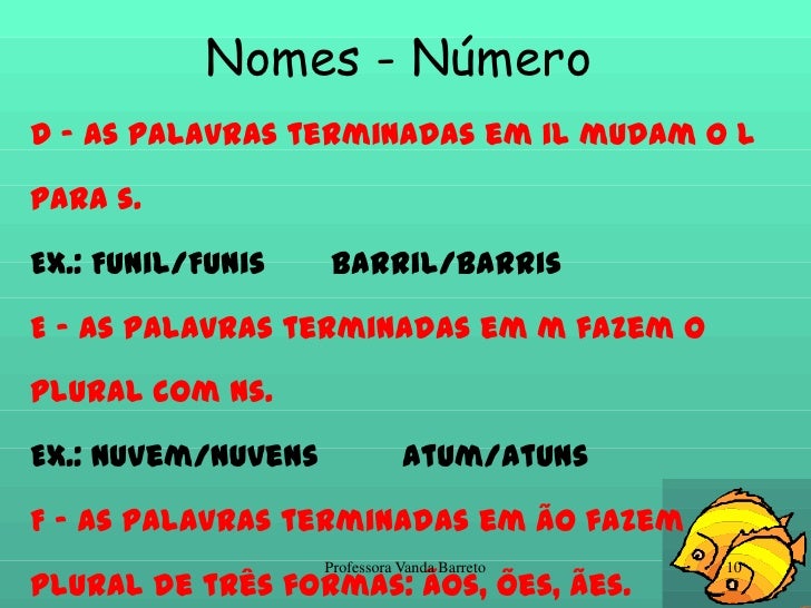 10. 10. Nomes - Número <br />D - As palavras terminadas em il mudam o l para s.Ex.: Funil/Funis Barril/Barris<br />E - As palavras terminadas em m fazem o plural com ns.Ex.: Nuvem/Nuvens Atum/AtunsF - As palavras terminadas em ão fazem plural de três formas: ãos, ões, ães.Ex.: Mão/Mãos Leitão/Leitões Pão/Pães<br />10<br />Professora Vanda Barreto<br />