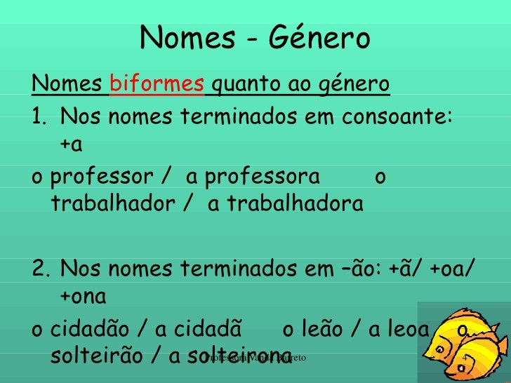 4. 4. Nomes - Género <br />Nomes biformes quanto ao género<br />Nos nomes terminados em consoante: +a <br />o professor / a professora o trabalhador / a trabalhadora <br /> <br />Nos nomes terminados em –ão: +ã/ +oa/ +ona<br />o cidadão / a cidadã o leão / a leoa o solteirão / a solteirona<br /> <br />4<br />Professora Vanda Barreto<br />