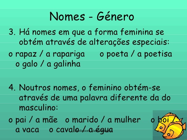 5. 5. Nomes - Género <br />Há nomes em que a forma feminina se obtém através de alterações especiais:<br />o rapaz / a rapariga o poeta / a poetisa o galo / a galinha<br /> <br />Noutros nomes, o feminino obtém-se através de uma palavra diferente da do masculino:<br />o pai / a mãe o marido / a mulher o boi / a vaca o cavalo / a égua<br />5<br />Professora Vanda Barreto<br />