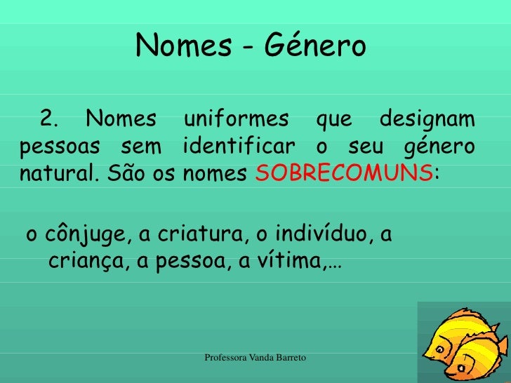 7. 7. Nomes - Género <br />2. Nomes uniformes que designam pessoas sem identificar o seu género natural. São os nomes SOBRECOMUNS:<br /> o cônjuge, a criatura, o indivíduo, a criança, a pessoa, a vítima,…<br />Professora Vanda Barreto<br />7<br />