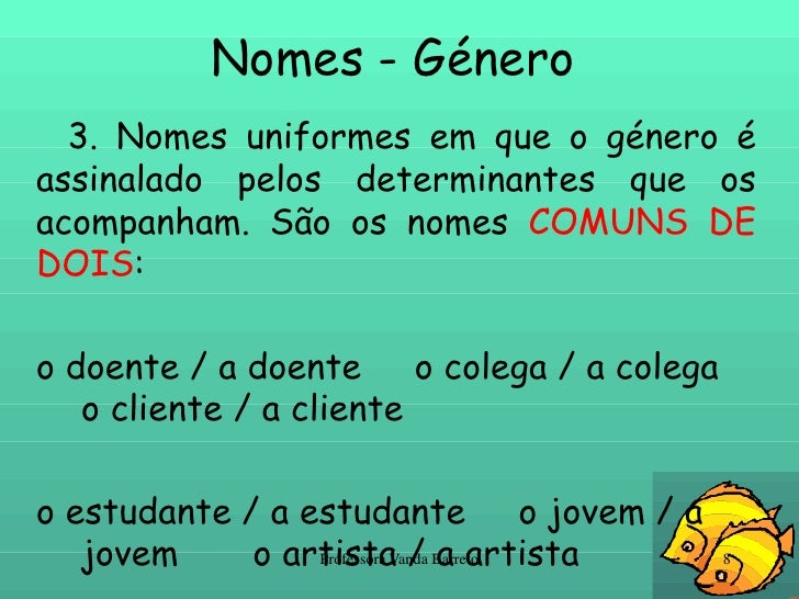 8. 8. Nomes - Género <br />3. Nomes uniformes em que o género é assinalado pelos determinantes que os acompanham. São os nomes COMUNS DE DOIS:<br /> <br />o doente / a doente o colega / a colega o cliente / a cliente <br />o estudante / a estudante o jovem / a jovem o artista / a artista<br />8<br />Professora Vanda Barreto<br />