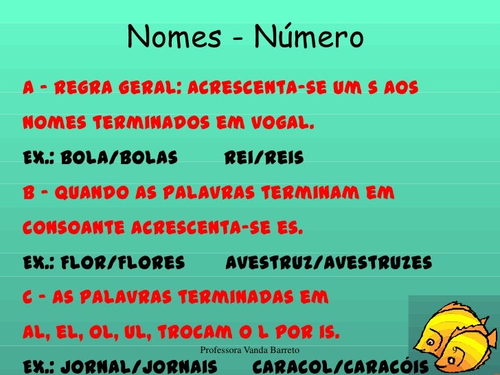 9. 9. Nomes - Número <br />A - Regra Geral: Acrescenta-se um s aos nomes terminados em vogal.Ex.: Bola/Bolas Rei/ReisB - Quando as palavras terminam em consoante acrescenta-se es.Ex.: Flor/Flores Avestruz/AvestruzesC - As palavras terminadas em al, el, ol, ul, trocam o l por is.Ex.: Jornal/Jornais Caracol/Caracóis Azul/Azuis<br />9<br />Professora Vanda Barreto<br />
