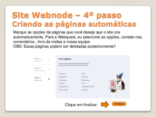 10. 10. Site Webnode – 4º passo Criando as páginas automáticas Marque as opções de páginas que você deseja que o site crie automaticamente. Para a Webquest, eu selecionei as opções, contate-nos, comentários , livro de visitas e nossa equipe. OBS: Essas páginas podem ser deletadas posteriormente!! Clique em finalizar