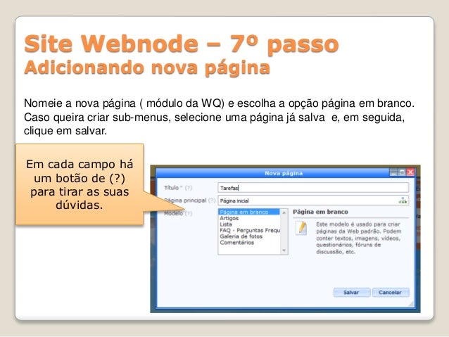 13. 13. Site Webnode – 7º passo Adicionando nova página Nomeie a nova página ( módulo da WQ) e escolha a opção página em branco. Caso queira criar sub-menus, selecione uma página já salva e, em seguida, clique em salvar. Em cada campo há um botão de (?) para tirar as suas dúvidas.