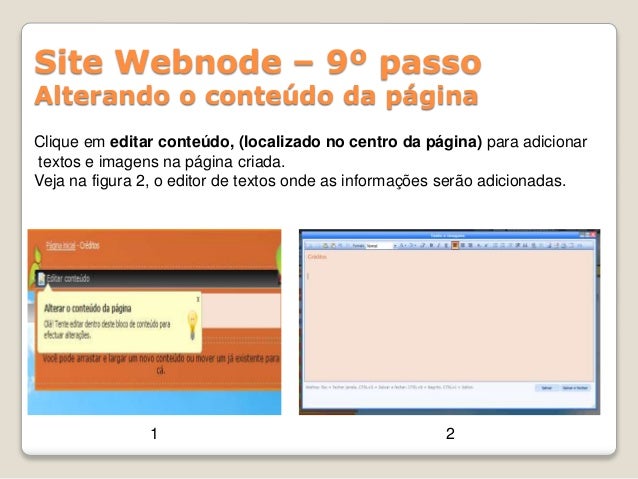 15. 15. Site Webnode – 9º passo Alterando o conteúdo da página Clique em editar conteúdo, (localizado no centro da página) para adicionar textos e imagens na página criada. Veja na figura 2, o editor de textos onde as informações serão adicionadas. 1 2