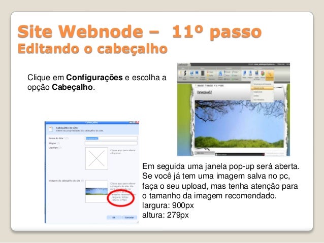 17. 17. Site Webnode – 11º passo Editando o cabeçalho Clique em Configurações e escolha a opção Cabeçalho. Em seguida uma janela pop-up será aberta. Se você já tem uma imagem salva no pc, faça o seu upload, mas tenha atenção para o tamanho da imagem recomendado. largura: 900px altura: 279px