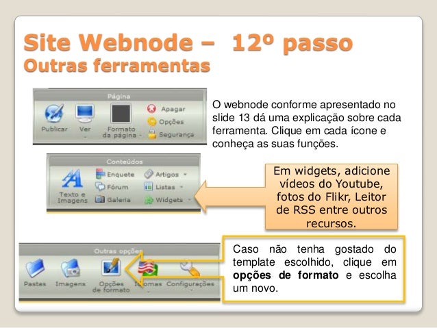 18. 18. Site Webnode – 12º passo Outras ferramentas O webnode conforme apresentado no slide 13 dá uma explicação sobre cada ferramenta. Clique em cada ícone e conheça as suas funções. Em widgets, adicione vídeos do Youtube, fotos do Flikr, Leitor de RSS entre outros recursos. Caso não tenha gostado do template escolhido, clique em opções de formato e escolha um novo.