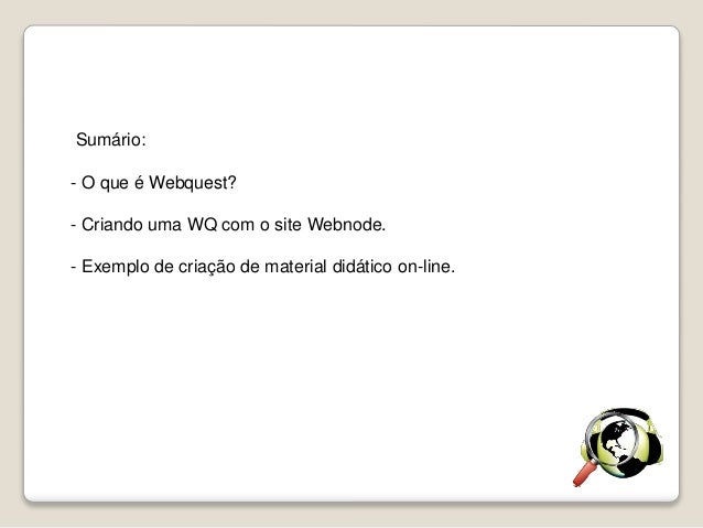 2. 2. Sumário: - O que é Webquest? - Criando uma WQ com o site Webnode. - Exemplo de criação de material didático on-line.