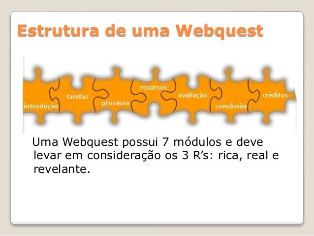 4. 4. Uma Webquest possui 7 módulos e deve levar em consideração os 3 R’s: rica, real e revelante. Estrutura de uma Webquest