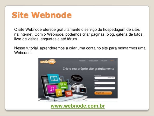 6. 6. Site Webnode O site Webnode oferece gratuitamente o serviço de hospedagem de sites na internet. Com o Webnode, podemos criar páginas, blog, galeria de fotos, livro de visitas, enquetes e até fórum. Nesse tutorial aprenderemos a criar uma conta no site para montarmos uma Webquest. www.webnode.com.br