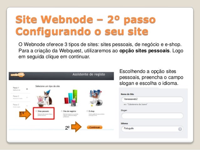 8. 8. Site Webnode – 2º passo Configurando o seu site O Webnode oferece 3 tipos de sites: sites pessoais, de negócio e e-shop. Para a criação da Webquest, utilizaremos ao opção sites pessoais. Logo em seguida clique em continuar. 1º 2º Escolhendo a opção sites pessoais, preencha o campo slogan e escolha o idioma.
