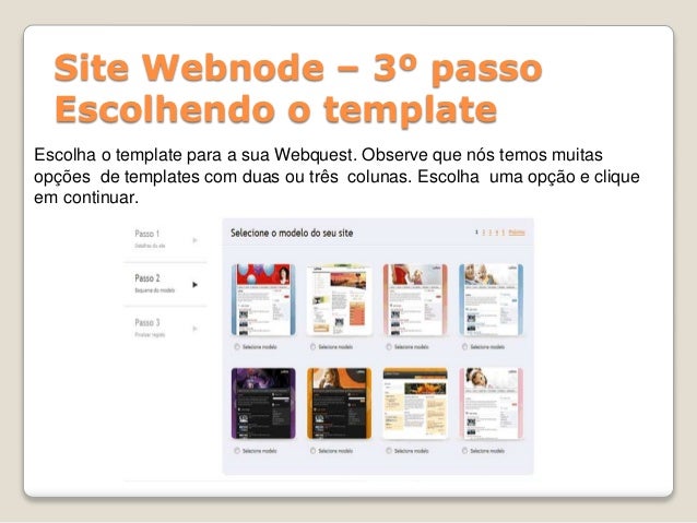 9. 9. Site Webnode – 3º passo Escolhendo o template Escolha o template para a sua Webquest. Observe que nós temos muitas opções de templates com duas ou três colunas. Escolha uma opção e clique em continuar.