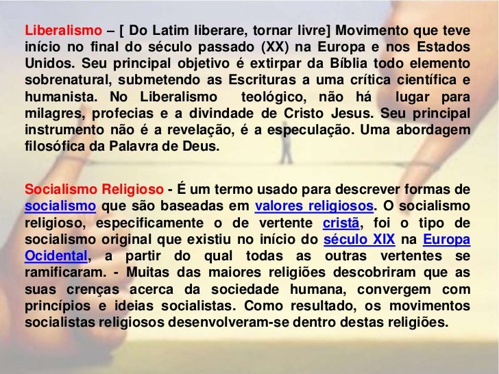 10. 10. Liberalismo – [ Do Latim liberare, tornar livre] Movimento que teve início no final do século passado (XX) na Europa e nos Estados Unidos. Seu principal objetivo é extirpar da Bíblia todo elemento sobrenatural, submetendo as Escrituras a uma crítica científica e humanista. No Liberalismo teológico, não há lugar para milagres, profecias e a divindade de Cristo Jesus. Seu principal instrumento não é a revelação, é a especulação. Uma abordagem filosófica da Palavra de Deus.<br />Socialismo Religioso - É um termo usado para descrever formas de socialismo que são baseadas em valores religiosos. O socialismo religioso, especificamente o de vertente cristã, foi o tipo de socialismo original que existiu no início do século XIX na Europa Ocidental, a partir do qual todas as outras vertentes se ramificaram. - Muitas das maiores religiões descobriram que as suas crenças acerca da sociedade humana, convergem com princípios e ideias socialistas. Como resultado, os movimentos socialistas religiosos desenvolveram-se dentro destas religiões.<br />