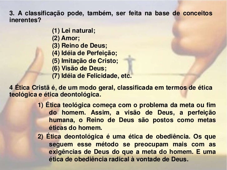11. 11. 3. A classificação pode, também, ser feita na base de conceitos inerentes?<br />(1) Lei natural;<br />(2) Amor;<br />(3) Reino de Deus;<br />(4) Idéia de Perfeição;<br />(5) Imitação de Cristo;<br />(6) Visão de Deus;<br />(7) Idéia de Felicidade, etc.<br />4 Ética Cristã é, de um modo geral, classificada em termos de ética teológica e ética deontológica.<br />1) Ética teológica começa com o problema da meta ou fim do homem. Assim, a visão de Deus, a perfeição humana, o Reino de Deus são postos como metas éticas do homem.<br />2) Ética deontológica é uma ética de obediência. Os que seguem esse método se preocupam mais com as exigências de Deus do que a meta do homem. E uma ética de obediência radical à vontade de Deus.<br />
