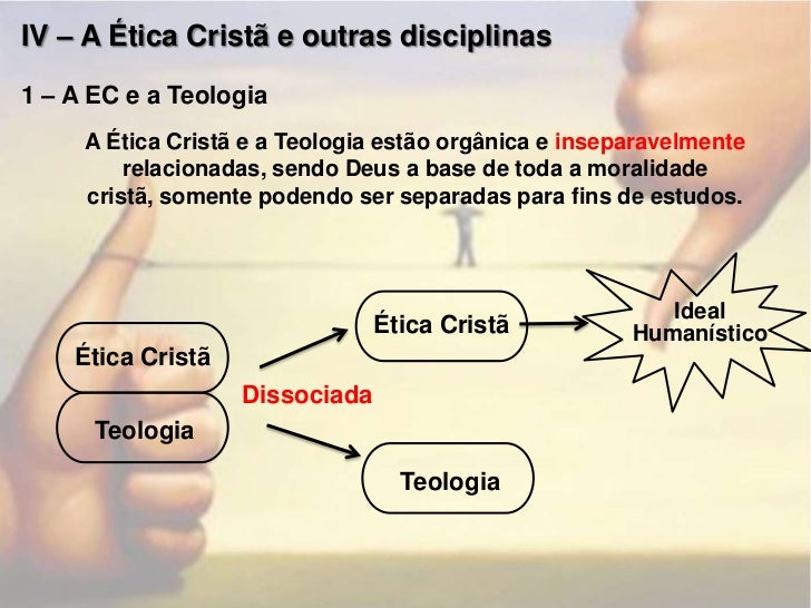 13. 13. IV – A Ética Cristã e outras disciplinas<br />1 – A EC e a Teologia<br />A Ética Cristã e a Teologia estão orgânica e inseparavelmente relacionadas, sendo Deus a base de toda a moralidade cristã, somente podendo ser separadas para fins de estudos.<br />Ética Cristã<br />Ideal Humanístico<br />Ética Cristã<br />Dissociada<br />Teologia<br />Teologia<br />