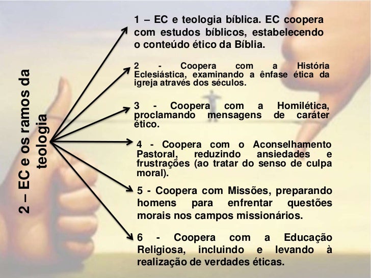 14. 14. 1 – EC e teologia bíblica. EC coopera com estudos bíblicos, estabelecendo o conteúdo ético da Bíblia.<br />2 - Coopera com a História Eclesiástica, examinando a ênfase ética da igreja através dos séculos.<br />3 - Coopera com a Homilética, proclamando mensagens de caráter ético.<br />2 – EC e os ramos da teologia<br />4 - Coopera com o Aconselhamento Pastoral, reduzindo ansiedades e frustrações (ao tratar do senso de culpa moral).<br />5 - Coopera com Missões, preparando homens para enfrentar questões morais nos campos missionários.<br />6 - Coopera com a Educação Religiosa, incluindo e levando à realização de verdades éticas.<br />