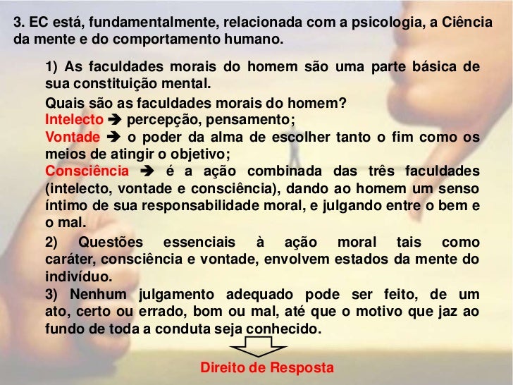 15. 15. 3. EC está, fundamentalmente, relacionada com a psicologia, a Ciência da mente e do comportamento humano.<br />1) As faculdades morais do homem são uma parte básica de sua constituição mental.<br />Quais são as faculdades morais do homem?<br />Intelecto percepção, pensamento;<br />Vontade  o poder da alma de escolher tanto o fim como os meios de atingir o objetivo;<br />Consciência  é a ação combinada das três faculdades (intelecto, vontade e consciência), dando ao homem um senso íntimo de sua responsabilidade moral, e julgando entre o bem e o mal.<br />2) Questões essenciais à ação moral tais como caráter, consciência e vontade, envolvem estados da mente do indivíduo.<br />3) Nenhum julgamento adequado pode ser feito, de um ato, certo ou errado, bom ou mal, até que o motivo que jaz ao fundo de toda a conduta seja conhecido.<br />Direito de Resposta<br />