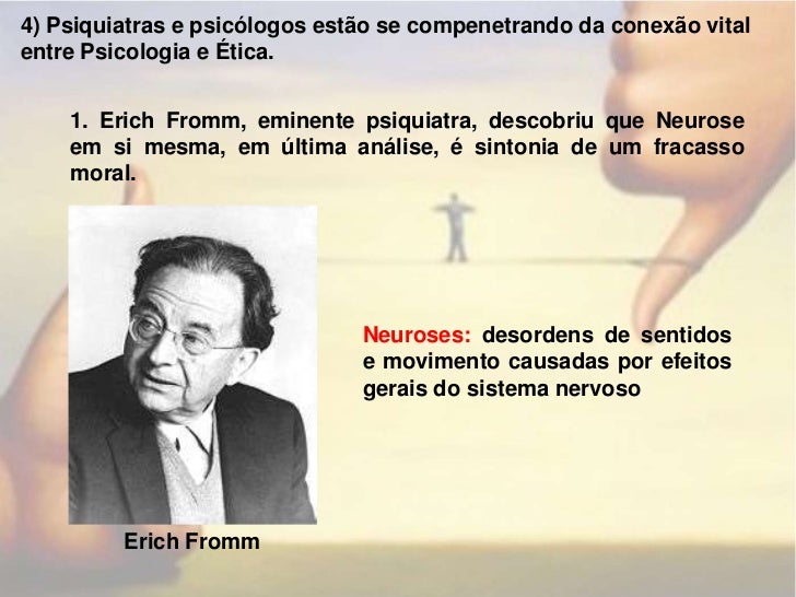 16. 16. 4) Psiquiatras e psicólogos estão se compenetrando da conexão vital entre Psicologia e Ética.<br />1. Erich Fromm, eminente psiquiatra, descobriu que Neurose em si mesma, em última análise, é sintonia de um fracasso moral.<br />Neuroses:desordens de sentidos e movimento causadas por efeitos gerais do sistema nervoso<br />Erich Fromm<br />