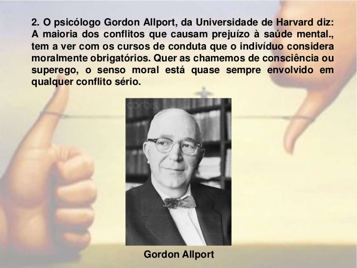 17. 17. 2. O psicólogo Gordon Allport, da Universidade de Harvard diz: A maioria dos conflitos que causam prejuízo à saúde mental., tem a ver com os cursos de conduta que o indivíduo considera moralmente obrigatórios. Quer as chamemos de consciência ou superego, o senso moral está quase sempre envolvido em qualquer conflito sério.<br />Gordon Allport<br />