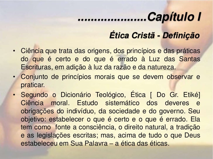 2. 2. .....................Capítulo I<br />Ética Cristã - Definição<br />Ciência que trata das origens, dos princípios e das práticas do que é certo e do que é errado à Luz das Santas Escrituras, em adição à luz da razão e da natureza.<br />Conjunto de princípios morais que se devem observar e praticar.<br />Segundo o Dicionário Teológico, Ética [ Do Gr. Etiké] Ciência moral. Estudo sistemático dos deveres e obrigações do indivíduo, da sociedade e do governo. Seu objetivo: estabelecer o que é certo e o que é errado. Ela tem como fonte a consciência, o direito natural, a tradição e as legislações escritas; mas, acima de tudo o que Deus estabeleceu em Sua Palavra – a ética das éticas. <br />