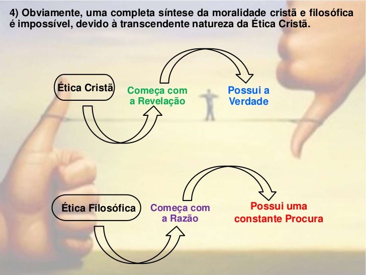 21. 21. 4) Obviamente, uma completa síntese da moralidade cristã e filosófica é impossível, devido à transcendente natureza da Ética Cristã.<br />Ética Cristã<br />Começa com a Revelação<br />Possui a Verdade<br />Possui uma constante Procura<br />Ética Filosófica<br />Começa com a Razão<br />
