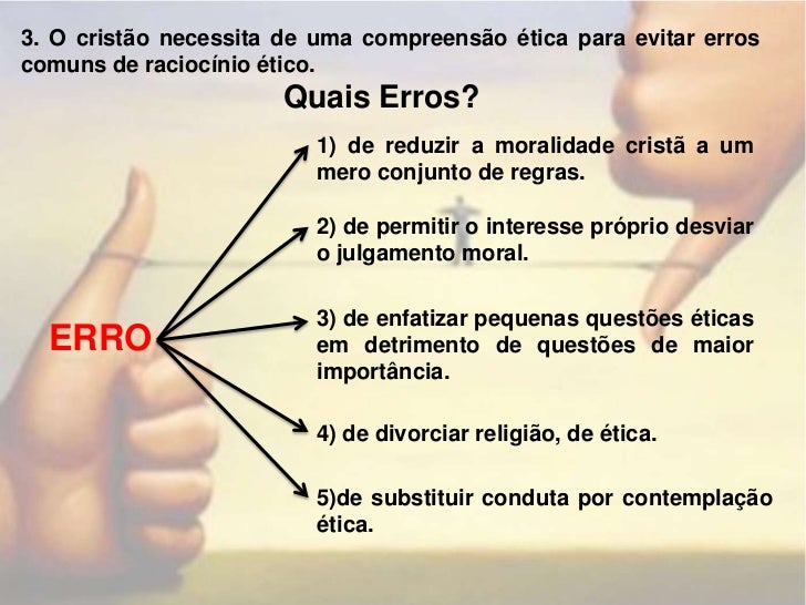 23. 23. 3. O cristão necessita de uma compreensão ética para evitar erros comuns de raciocínio ético.<br />Quais Erros?<br />1) de reduzir a moralidade cristã a um mero conjunto de regras.<br />2) de permitir o interesse próprio desviar o julgamento moral.<br />3) de enfatizar pequenas questões éticas em detrimento de questões de maior importância.<br />ERRO<br />4) de divorciar religião, de ética.<br />5)de substituir conduta por contemplação ética.<br />