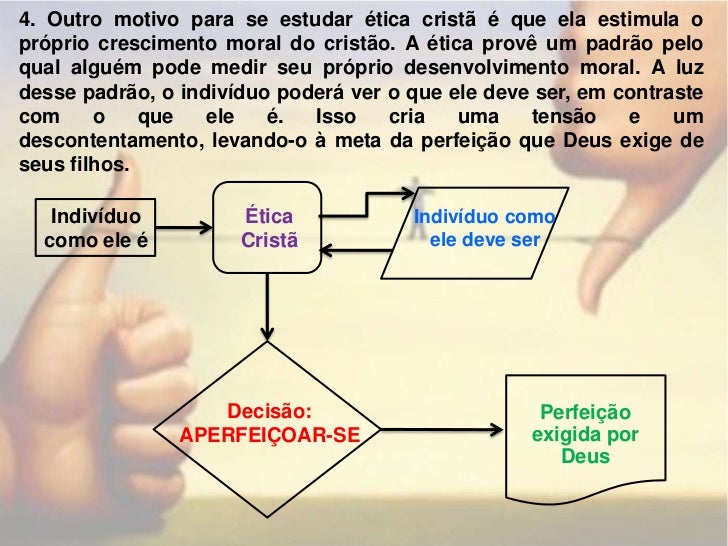 24. 24. 4. Outro motivo para se estudar ética cristã é que ela estimula o próprio crescimento moral do cristão. A ética provê um padrão pelo qual alguém pode medir seu próprio desenvolvimento moral. A luz desse padrão, o indivíduo poderá ver o que ele deve ser, em contraste com o que ele é. Isso cria uma tensão e um descontentamento, levando-o à meta da perfeição que Deus exige de seus filhos.<br />Indivíduo como ele é<br />Ética<br />Cristã<br />Indivíduo como ele deve ser<br />Decisão:<br />APERFEIÇOAR-SE<br />Perfeição exigida por Deus<br />