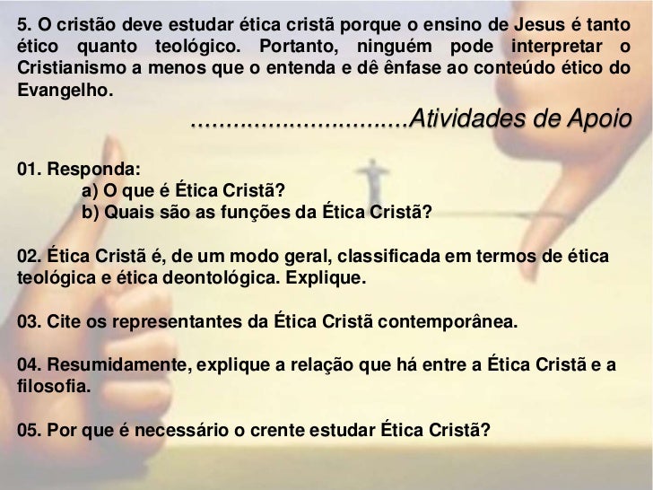 25. 25. 5. O cristão deve estudar ética cristã porque o ensino de Jesus é tanto ético quanto teológico. Portanto, ninguém pode interpretar o Cristianismo a menos que o entenda e dê ênfase ao conteúdo ético do Evangelho.<br />...............................Atividades de Apoio<br />01. Responda:<br /> a) O que é Ética Cristã?<br /> b) Quais são as funções da Ética Cristã?<br />02. Ética Cristã é, de um modo geral, classificada em termos de ética teológica e ética deontológica. Explique.<br />03. Cite os representantes da Ética Cristã contemporânea.<br />04. Resumidamente, explique a relação que há entre a Ética Cristã e a filosofia.<br />05. Por que é necessário o crente estudar Ética Cristã?<br />