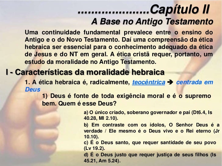 26. 26. .....................Capítulo II<br />A Base no Antigo Testamento<br />Uma continuidade fundamental prevalece entre o ensino do Antigo e o do Novo Testamento. Daí uma compreensão da ética hebraica ser essencial para o conhecimento adequado da ética de Jesus e do NT em geral. A ética cristã requer, portanto, um estudo da moralidade no Antigo Testamento.<br />I - Características da moralidade hebraica<br />1. A ética hebraica é, radicalmente, teocêntrica centrada em Deus<br />1) Deus é fonte de toda exigência moral e é o supremo bem. Quem é esse Deus?<br />a) O único criado, soberano governador e pai (Dt6.4, Is 40.28, Ml 2.10).<br />b) Em contraste com os ídolos, O Senhor Deus é a verdade / Ele mesmo é o Deus vivo e o Rei eterno (Jr 10.10).<br />c) É o Deus santo, que requer santidade de seu povo (Lv 19.2).<br />d) É o Deus justo que requer justiça de seus filhos (Is 45.21, Am 5.24).<br />