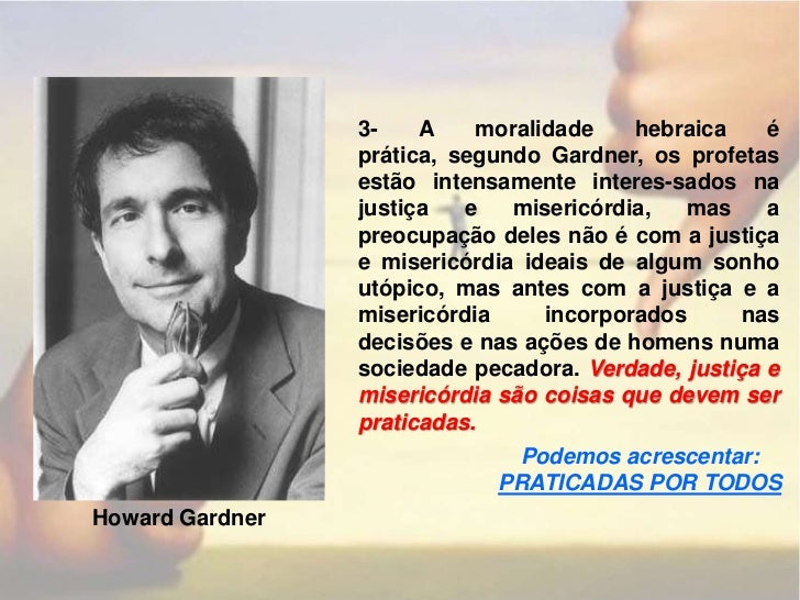 29. 29. 3- A moralidade hebraica é prática, segundo Gardner, os profetas estão intensamente interes-sados na justiça e misericórdia, mas a preocupação deles não é com a justiça e misericórdia ideais de algum sonho utópico, mas antes com a justiça e a misericórdia incorporados nas decisões e nas ações de homens numa sociedade pecadora. Verdade, justiça e misericórdia são coisas que devem ser praticadas.<br />Podemos acrescentar:PRATICADAS POR TODOS<br />Howard Gardner<br />