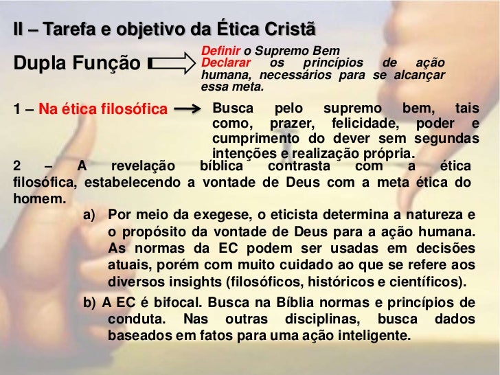 3. 3. II – Tarefa e objetivo da Ética Cristã<br />Definir o Supremo Bem<br />Declarar os princípios de ação humana, necessários para se alcançar essa meta.<br />Dupla Função<br />1 – Na ética filosófica<br />Busca pelo supremo bem, tais como, prazer, felicidade, poder e cumprimento do dever sem segundas intenções e realização própria.<br />2 – A revelação bíblica contrasta com a ética filosófica, estabelecendo a vontade de Deus com a meta ética do homem.<br />Por meio da exegese, o eticista determina a natureza e o propósito da vontade de Deus para a ação humana. As normas da EC podem ser usadas em decisões atuais, porém com muito cuidado ao que se refere aos diversos insights (filosóficos, históricos e científicos).<br />b) A EC é bifocal. Busca na Bíblia normas e princípios de conduta. Nas outras disciplinas, busca dados baseados em fatos para uma ação inteligente.<br />