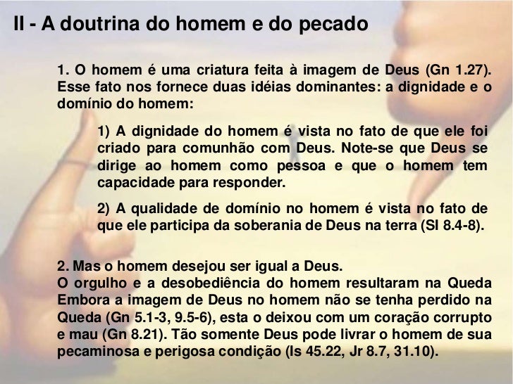 30. 30. II - A doutrina do homem e do pecado<br />1. O homem é uma criatura feita à imagem de Deus (Gn 1.27). Esse fato nos fornece duas idéias dominantes: a dignidade e o domínio do homem:<br />1) A dignidade do homem é vista no fato de que ele foi criado para comunhão com Deus. Note-se que Deus se dirige ao homem como pessoa e que o homem tem capacidade para responder.<br />2) A qualidade de domínio no homem é vista no fato de que ele participa da soberania de Deus na terra (SI 8.4-8).<br />2. Mas o homem desejou ser igual a Deus.<br />O orgulho e a desobediência do homem resultaram na Queda Embora a imagem de Deus no homem não se tenha perdido na Queda (Gn 5.1-3, 9.5-6), esta o deixou com um coração corrupto e mau (Gn 8.21). Tão somente Deus pode livrar o homem de sua pecaminosa e perigosa condição (Is 45.22, Jr 8.7, 31.10).<br />
