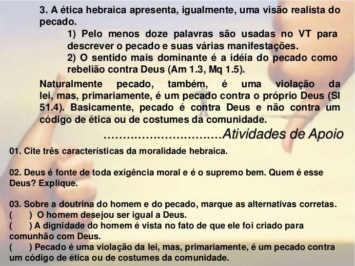 31. 31. 3. A ética hebraica apresenta, igualmente, uma visão realista do pecado.<br />1) Pelo menos doze palavras são usadas no VT para descrever o pecado e suas várias manifestações.<br />2) O sentido mais dominante é a idéia do pecado como rebelião contra Deus (Am 1.3, Mq 1.5).<br />Naturalmente pecado, também, é uma violação da lei, mas, primariamente, é um pecado contra o próprio Deus (SI 51.4). Basicamente, pecado é contra Deus e não contra um código de ética ou de costumes da comunidade.<br />...............................Atividades de Apoio<br />01. Cite três características da moralidade hebraica.<br />02. Deus é fonte de toda exigência moral e é o supremo bem. Quem é esse Deus? Explique.<br />03. Sobre a doutrina do homem e do pecado, marque as alternativas corretas.<br />( ) O homem desejou ser igual a Deus.<br />( ) A dignidade do homem é vista no fato de que ele foi criado para comunhão com Deus.<br />( ) Pecado é uma violação da lei, mas, primariamente, é um pecado contra um código de ética ou de costumes da comunidade.<br />
