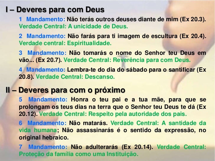 33. 33. I – Deveres para com Deus<br />1° Mandamento: Não terás outros deuses diante de mim (Ex 20.3). Verdade Central: A unicidade de Deus.<br />2° Mandamento: Não farás para ti imagem de escultura (Ex 20.4). Verdade central: Espiritualidade.<br />3° Mandamento: Não tomarás o nome do Senhor teu Deus em vão... (Ex 20.7). Verdade Central: Reverência para com Deus.<br />4° Mandamento: Lembra-te do dia do sábado para o santificar (Ex 20.8). Verdade Central: Descanso.<br />II – Deveres para com o próximo<br />5° Mandamento: Honra o teu pai e a tua mãe, para que se prolongam os teus dias na terra que o Senhor teu Deus te dá (Ex 20.12). Verdade Central: Respeito pela autoridade dos pais.<br />6° Mandamento: Não matarás. Verdade Central: A santidade da vida humana; Não assassinarás é o sentido da expressão, no original hebraico.<br />7° Mandamento: Não adulterarás (Ex 20.14). Verdade Central: Proteção da família como uma Instituição.<br />