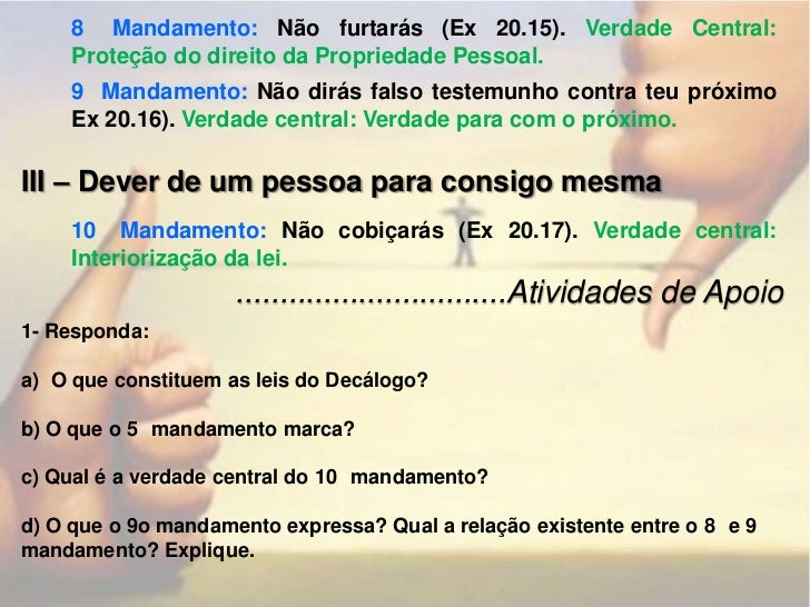 34. 34. 8° Mandamento: Não furtarás (Ex 20.15). Verdade Central: Proteção do direito da Propriedade Pessoal.<br />9° Mandamento: Não dirás falso testemunho contra teu próximo Ex 20.16). Verdade central: Verdade para com o próximo.<br />III – Dever de um pessoa para consigo mesma<br />10° Mandamento: Não cobiçarás (Ex 20.17). Verdade central: Interiorização da lei.<br />...............................Atividades de Apoio<br />1- Responda:<br />O que constituem as leis do Decálogo?<br />b) O que o 5° mandamento marca?<br />c) Qual é a verdade central do 10° mandamento?<br />d) O que o 9o mandamento expressa? Qual a relação existente entre o 8° e 9° mandamento? Explique.<br />