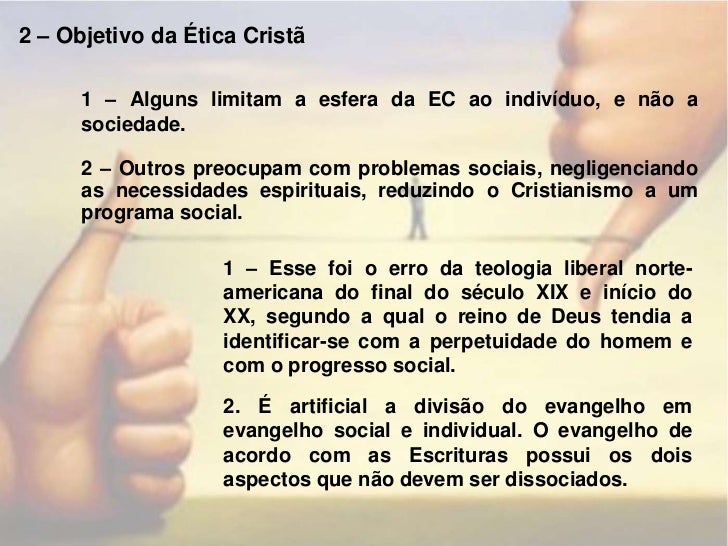 4. 4. 2 – Objetivo da Ética Cristã<br />1 – Alguns limitam a esfera da EC ao indivíduo, e não a sociedade. <br />2 – Outros preocupam com problemas sociais, negligenciando as necessidades espirituais, reduzindo o Cristianismo a um programa social.<br />1 – Esse foi o erro da teologia liberal norte-americana do final do século XIX e início do XX, segundo a qual o reino de Deus tendia a identificar-se com a perpetuidade do homem e com o progresso social.<br />2. É artificial a divisão do evangelho em evangelho social e individual. O evangelho de acordo com as Escrituras possui os dois aspectos que não devem ser dissociados.<br />