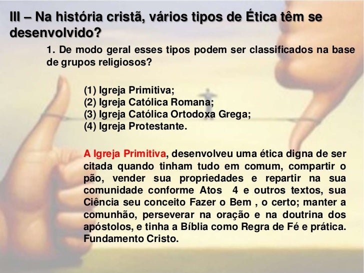5. 5. III – Na história cristã, vários tipos de Ética têm se desenvolvido?<br />1. De modo geral esses tipos podem ser classificados na base de grupos religiosos?<br />(1) Igreja Primitiva;<br />(2) Igreja Católica Romana;<br />(3) Igreja Católica Ortodoxa Grega;<br />(4) Igreja Protestante.<br />A Igreja Primitiva, desenvolveu uma ética digna de ser citada quando tinham tudo em comum, compartir o pão, vender sua propriedades e repartir na sua comunidade conforme Atos 4 e outros textos, sua Ciência seu conceito Fazer o Bem , o certo; manter a comunhão, perseverar na oração e na doutrina dos apóstolos, e tinha a Bíblia como Regra de Fé e prática. Fundamento Cristo.<br />