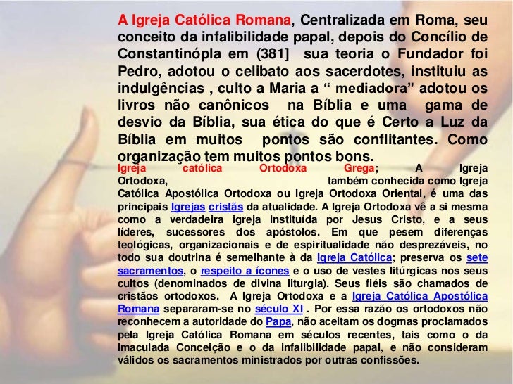 6. 6. A Igreja Católica Romana, Centralizada em Roma, seu conceito da infalibilidade papal, depois do Concílio de Constantinópla em (381] sua teoria o Fundador foi Pedro, adotou o celibato aos sacerdotes, instituiu as indulgências , culto a Maria a “ mediadora” adotou os livros não canônicos na Bíblia e uma gama de desvio da Bíblia, sua ética do que é Certo a Luz da Bíblia em muitos pontos são conflitantes. Como organização tem muitos pontos bons.<br />Igreja católica Ortodoxa Grega; A Igreja Ortodoxa, também conhecida como Igreja Católica Apostólica Ortodoxa ou Igreja Ortodoxa Oriental, é uma das principais Igrejascristãs da atualidade. A Igreja Ortodoxa vê a si mesma como a verdadeira igreja instituída por Jesus Cristo, e a seus líderes, sucessores dos apóstolos. Em que pesem diferenças teológicas, organizacionais e de espiritualidade não desprezáveis, no todo sua doutrina é semelhante à da Igreja Católica; preserva os sete sacramentos, o respeito a ícones e o uso de vestes litúrgicas nos seus cultos (denominados de divina liturgia). Seus fiéis são chamados de cristãos ortodoxos. A Igreja Ortodoxa e a Igreja Católica Apostólica Romana separaram-se no século XI . Por essa razão os ortodoxos não reconhecem a autoridade do Papa, não aceitam os dogmas proclamados pela Igreja Católica Romana em séculos recentes, tais como o da Imaculada Conceição e o da infalibilidade papal, e não consideram válidos os sacramentos ministrados por outras confissões. <br />
