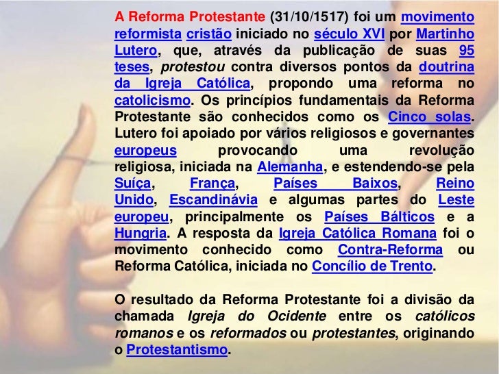 7. 7. A Reforma Protestante (31/10/1517) foi um movimento reformistacristão iniciado no século XVI por Martinho Lutero, que, através da publicação de suas 95 teses, protestou contra diversos pontos da doutrina da Igreja Católica, propondo uma reforma no catolicismo. Os princípios fundamentais da Reforma Protestante são conhecidos como os Cinco solas.Lutero foi apoiado por vários religiosos e governantes europeus provocando uma revolução religiosa, iniciada na Alemanha, e estendendo-se pela Suíça, França, Países Baixos, Reino Unido, Escandinávia e algumas partes do Leste europeu, principalmente os Países Bálticos e a Hungria. A resposta da Igreja Católica Romana foi o movimento conhecido como Contra-Reforma ou Reforma Católica, iniciada no Concílio de Trento. <br /> <br />O resultado da Reforma Protestante foi a divisão da chamada Igreja do Ocidente entre os católicos romanos e os reformados ou protestantes, originando o Protestantismo.<br />