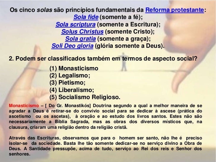 8. 8. Os cinco solas são princípios fundamentais da Reforma protestante: <br />Sola fide (somente a fé); <br />Sola scriptura (somente a Escritura); <br />Solus Christus (somente Cristo); <br />Sola gratia (somente a graça); <br />Soli Deo gloria (glória somente a Deus). <br />2. Podem ser classificados também em termos de aspecto social?<br />(1) Monasticismo<br />(2) Legalismo;<br />(3) Pietismo;<br />(4) Liberalismo;<br />(5) Socialismo Religioso.<br />Monasticismo – [ Do Gr. Monastikós] Doutrina segundo a qual a melhor maneira de se agradar a Deus é retirar-se do convívio social para se dedicar à ascese (prática do ascetismo ou os ascetas}, à oração e ao estudo dos livros santos. Estes não são necessariamente a Bíblia Sagrada, mas as obras dos diversos místicos que, na clausura, criaram uma religião dentro da religião cristã.<br /> <br />Através das Escrituras, observamos que para o homem ser santo, não lhe é preciso isolar-se da sociedade. Basta lhe tão somente dedicar-se no serviço divino a Obra de Deus. A Santidade pressupõe, acima de tudo, serviço ao Rei dos reis e Senhor dos senhores.<br />